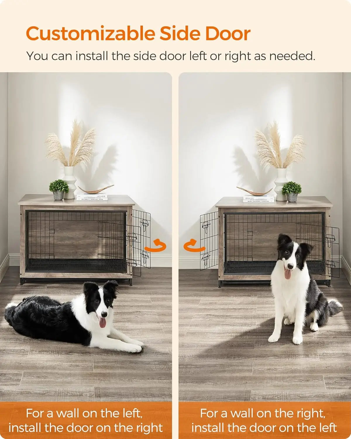 [Door Left, or Door Right] You decide. This dog kennel comes with 2 doors (1 front door and 1 side door) for your dog to go in and out easily; the side door can be either installed to the left or right to fit various spaces