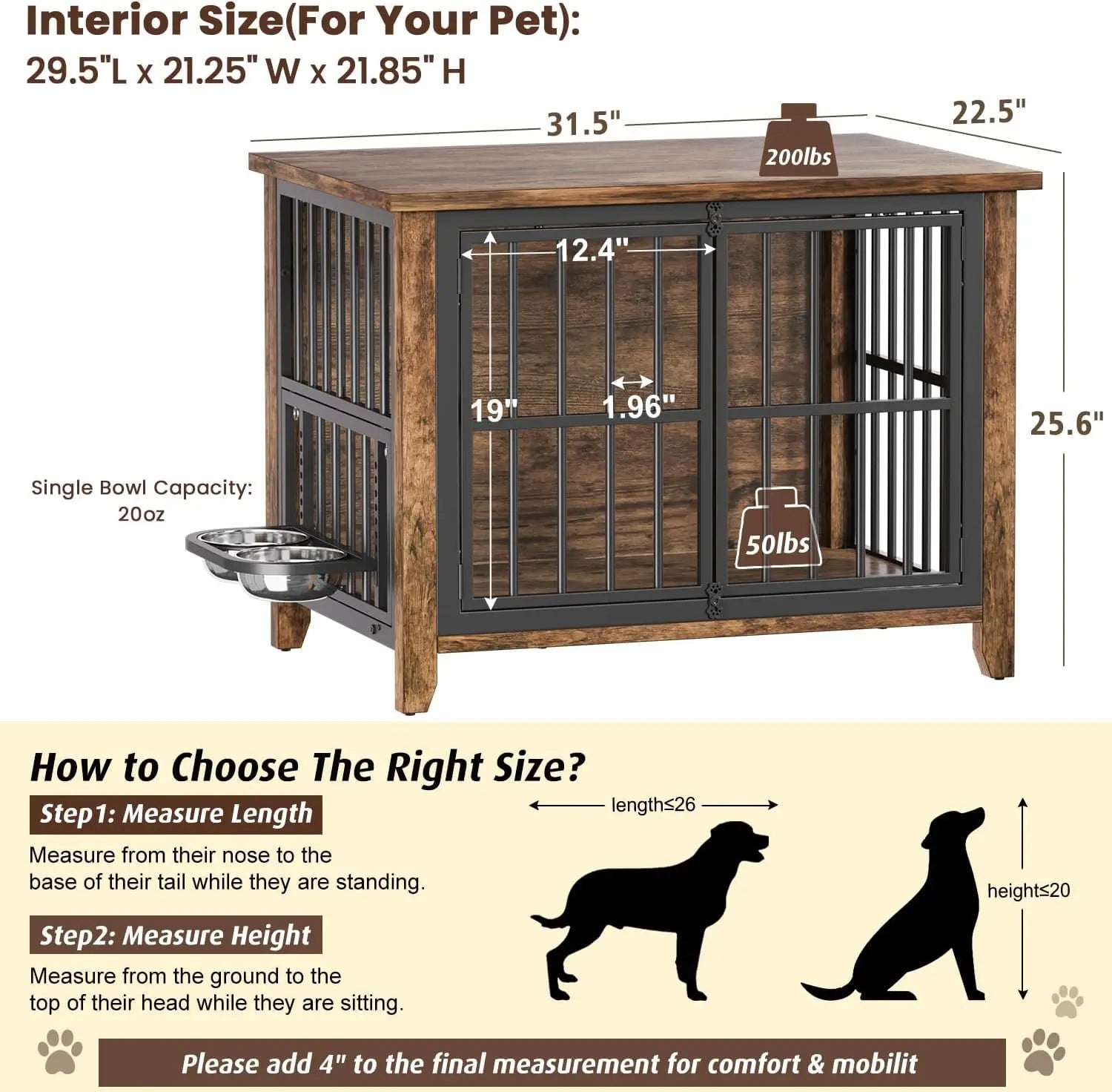 - Size Selection: With interior dimensions of 29.5"L x 21.25"W x 21.85"H and overall dimensions of 31.5"L x 22.5"W x 25.6"H, this dog cage is ideal for small to medium-sized dogs weighing up to 50 pounds(such as a French Bulldog, Dachshund, Welsh Corgi, etc). Please measure your dog before to ensure adequate space for movement.